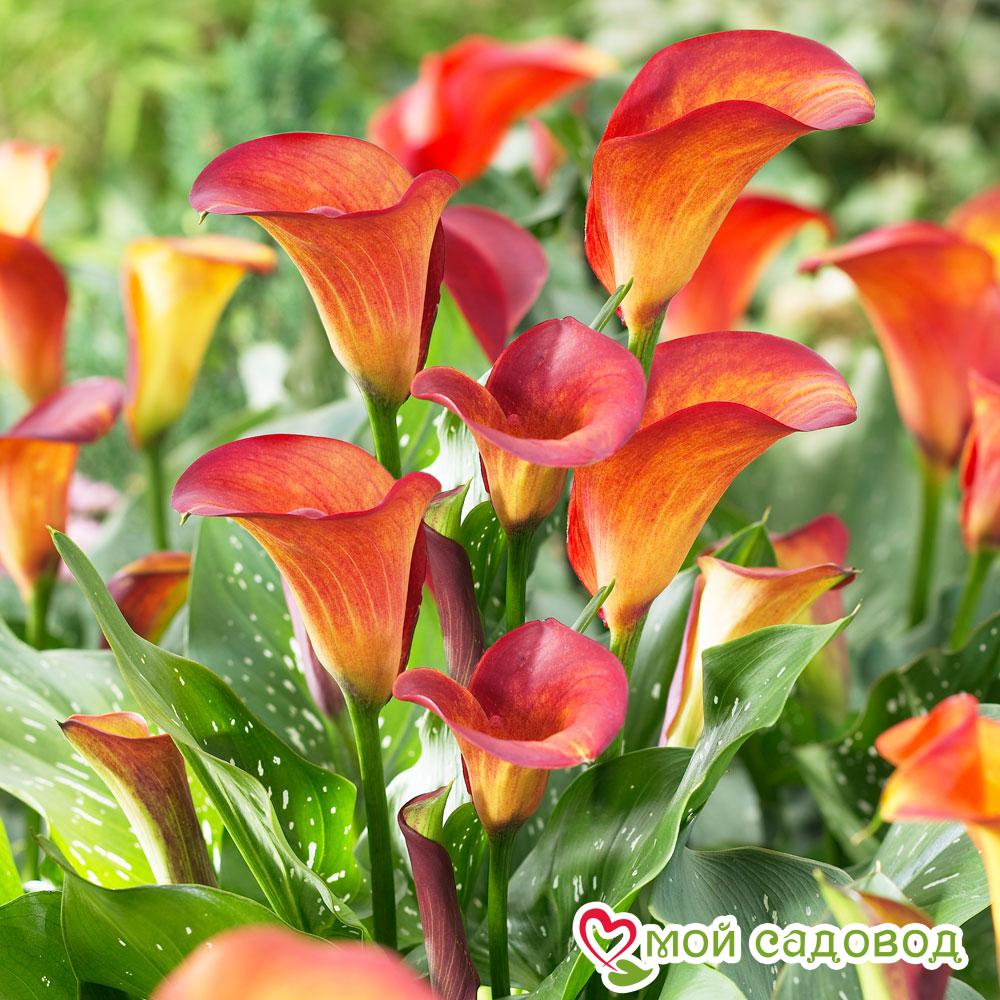 ПОСАДКА М УХОД. Рано весной в горшки для комнатной культуры, в открытый грунт — после того, как минует угроза заморозков. Клубни сажают на глубину 5-10 см и хорошо проливают почву, поскольку каллы любят влагу. Для посадки каллы подойдет притененный участок. Идеальный вариант, место под негустыми кронами деревьев. Чтобы было достаточно светло, а солнечные лучи не обжигали листьев. Очень эффектно смотрятся каллы, рядом с искусственным водоемом. Отлично цветет и растет только в тепле, где температура не ниже 18°C, самая оптимальная температура 22-23°C. Не переносит сквозняков. Цветоносы этого растения высокие, которые идут прямо от низа растения. На открытом воздухе это прекрасное растение цветет 1 месяц, а в закрытом помещении — 14 дней. Осенью растения сбрасывают листья. На зиму клубни каллы нужно выкопать и хранить в непромерзаемом помещении.